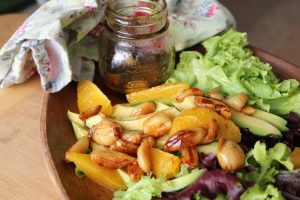 - Place lettuce, orange, avocado in a salad bowl. Remove garlic from oven and squeeze in the juice from the orange core. Mix and pour onto salad and mix well.