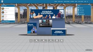 The fair spanned 10 hours, and visitors could log in and out as they pleased. Attendees entered an eye-catching virtual venue with moving escalators, a lobby with street signs linking to an expo hall, and a virtual auditorium where 11 sessions were held.