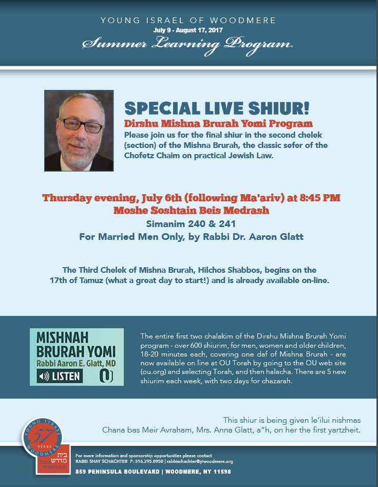 The final shiur of chelek beis, on siman 239 (kriyat Shema al hamitah), is scheduled for Monday, July 3. Rabbi Dr. Glatt will not be delivering online shiurim for simanim 240 and 241, which deal with marital intimacy. Rather, he will be delivering a live shiur for married men at the Young Israel of Woodmere on Thursday, July 6, at 8:45 PM (following Maariv). The shiur is being presented l’ilui nishmas Chana bas Meir Avraham (Mrs. Anna Glatt, a”h) on her the first yahrtzeit. (Click on the image of the flyer below for more information on the live shiur.) Hebrew text for simanim 240 and 241 will be posted online and Rabbi Dr. Glatt has made himself available to address questions from program participants.